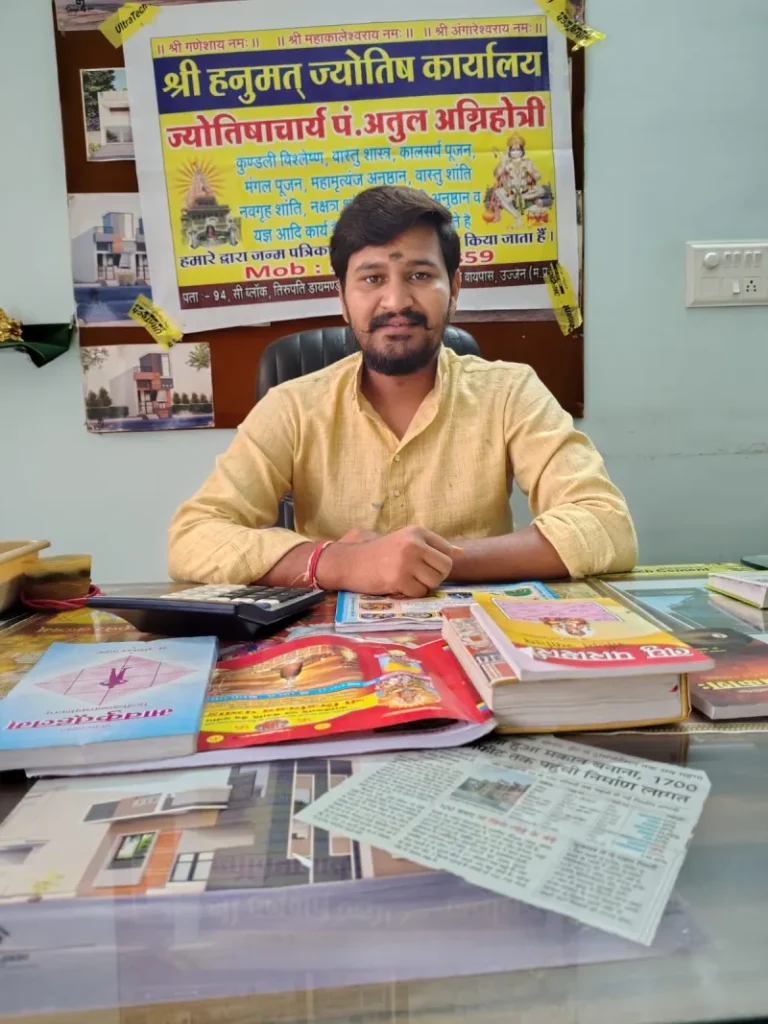 पंडित अतुल अग्निहोत्री जी, उज्जैन के अनुभवी ज्योतिषी और पंडित, आपके जीवन में सकारात्मक परिवर्तन लाने के लिए समर्पित हैं। वे विभिन्न प्रकार की धार्मिक अनुष्ठानों, विशेषकर दोष निवारण पूजा और मांगलिक कार्यों में माहिर हैं। उनके गहन ज्ञान और अनुभव ने उन्हें इस क्षेत्र में एक सम्मानित नाम बनाया है।